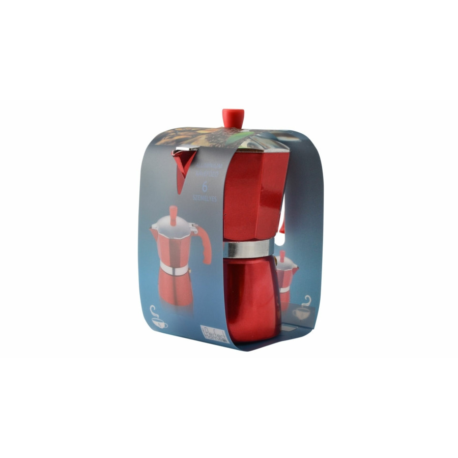 Anyaga: alumínium, műanyag.Mérete: 18,5 cm magas; 9 cm átmérőjű.Használható: gáz-, kerámialapos -, elektromos-tűzhelyen egyaránt.Hagyományos kotyogó kávéfőző kívül piros színben műanyag fogóval ellátva, hogy ne melegedjen át, mint az alumínium. 6 csésze kávé elkészítésére alkalmas.