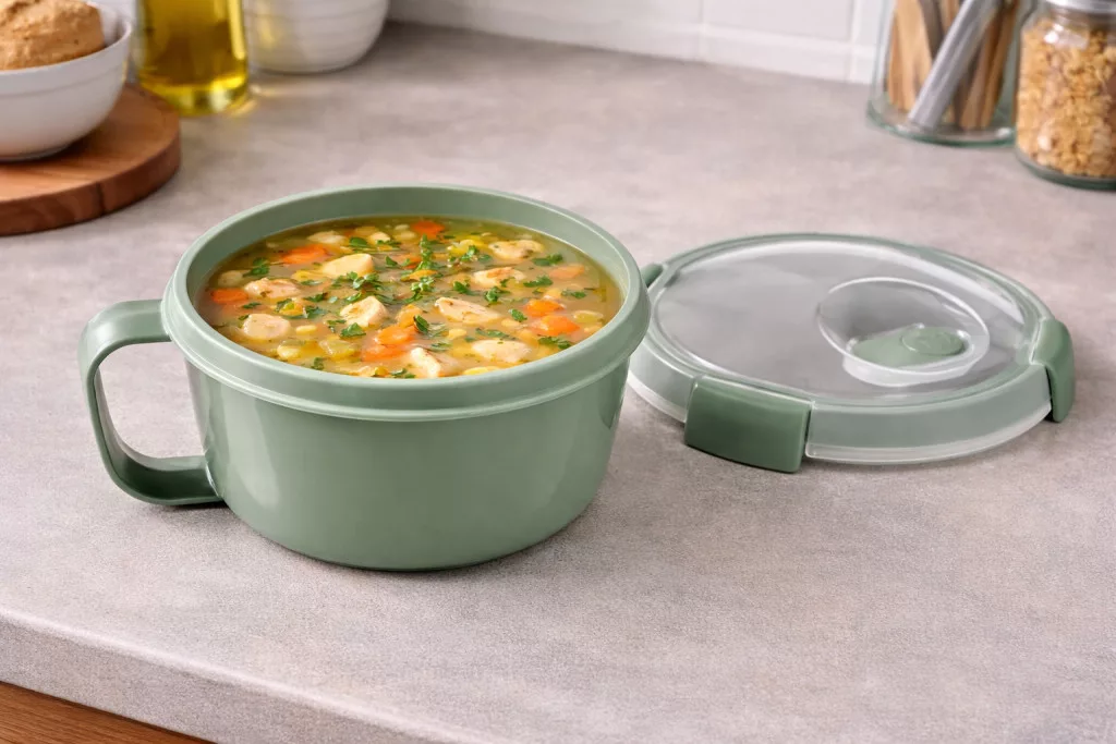 A CURVER Smart Eco kerek ételtartó 0,9 literes űrtartalommal ideális választás ételek frissen tartásához otthon vagy útközben. A 15,7x15,7x9,6 cm-es méret kompakt, mégis elegendő helyet biztosít levesek, főételek vagy saláták tárolására. A környezetbarát, újrahasznosított anyagból készült ételtartó tartós és megbízható, miközben hozzájárul a fenntartható mindennapokhoz. A jól záródó fedél segít megőrizni az ételek frissességét és biztonságos szállítást biztosít.