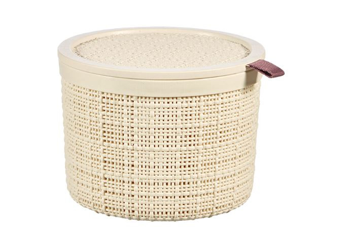 A Jute kerek doboz fedővel egy kis, 2 literes, egymásba helyezhető doboz, amelyet kézműves textíliák ihlettek. A 100%-ban újrahasznosított műanyagból készült, a Jute család többi tagjához hasonlóan a kis doboz ideális irodában, fürdőszobában vagy konyhában való használatra.