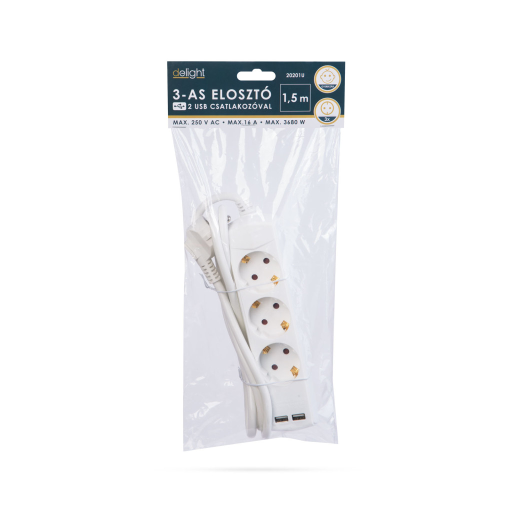 Elosztó 3-as - 3 x 1,5 mm² - 1,5 m - 2 x USB-vel