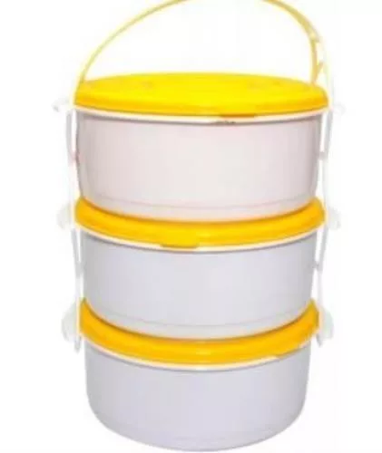 A 3 szintes műanyag ételhordó praktikus megoldás ételek szállítására munkába, iskolába vagy kirándulásra. Az egymásra helyezhető, 1 literes tálak külön tárolják az ételeket, míg a csatos, fedeles kialakítás biztonságos zárást biztosít.