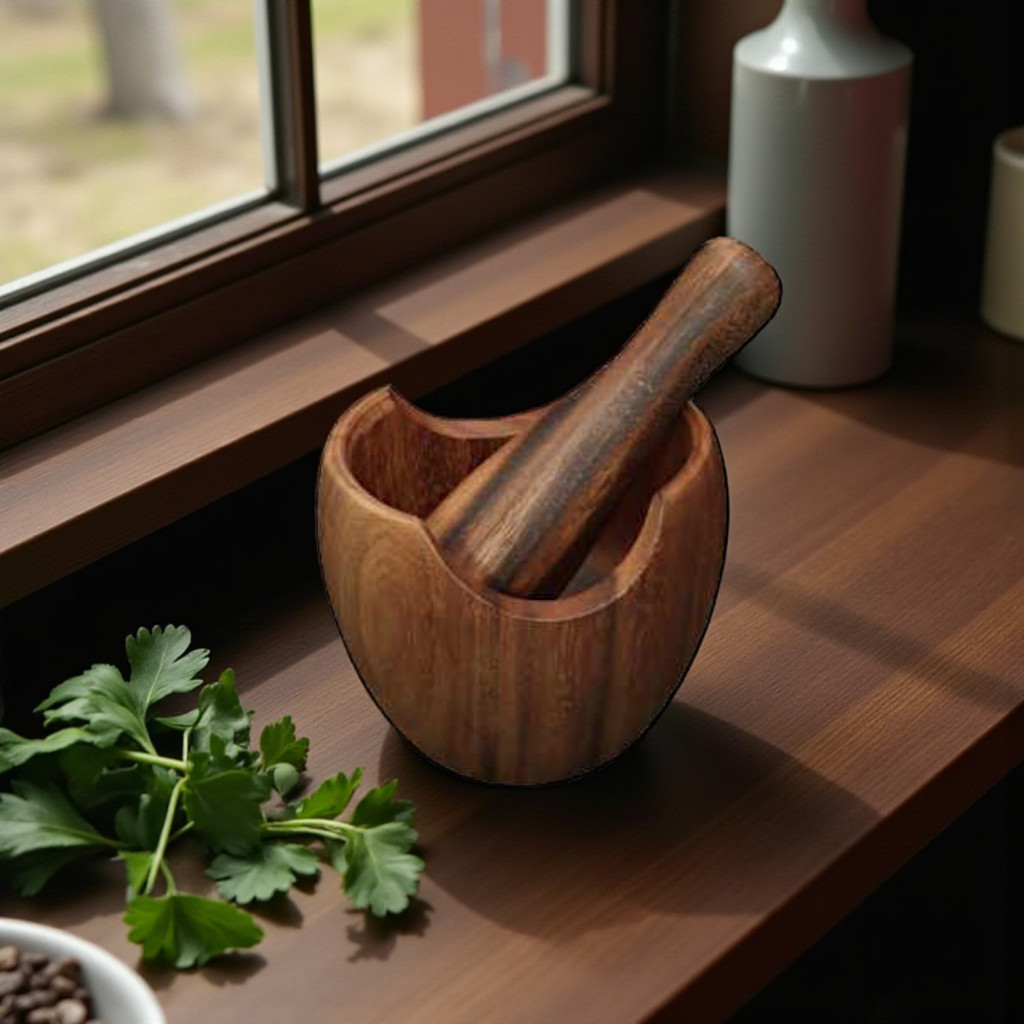 Ez a fa mozsár 12 × 10 cm‑es méretben készült, természetes faanyagból, íves peremmel a kényelmes használatért. Ideális fűszerek, gyógynövények, diófélék vagy fokhagyma zúzására. Masszív, mégis egyszerű kialakítású, amely meleg, rusztikus hangulatot kölcsönöz a konyhádnak.