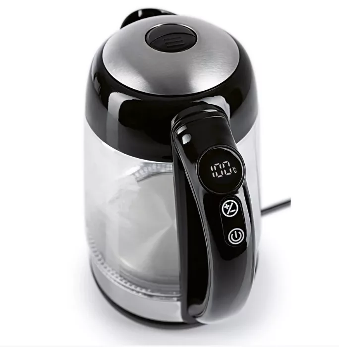 A GOURMETMAXX 1,7 literes üveg vízforraló elegáns fekete, rozsdamentes acél és boroszilikát üveg kivitelben készült. 2200 W teljesítménye gyors felforralást biztosít, míg a digitális kijelző és a 40–100 °C között választható 7 hőfok pontos beállítást tesz lehetővé teához, kávéhoz vagy más italokhoz. A 6 színű LED világítás egy pillantással jelzi a víz hőmérsékletét, modern megjelenést adva a konyhának. Mérete: ~22*18,7*25 cm Űrtartalom: 1,7 liter Teljesítmény: 2200 W