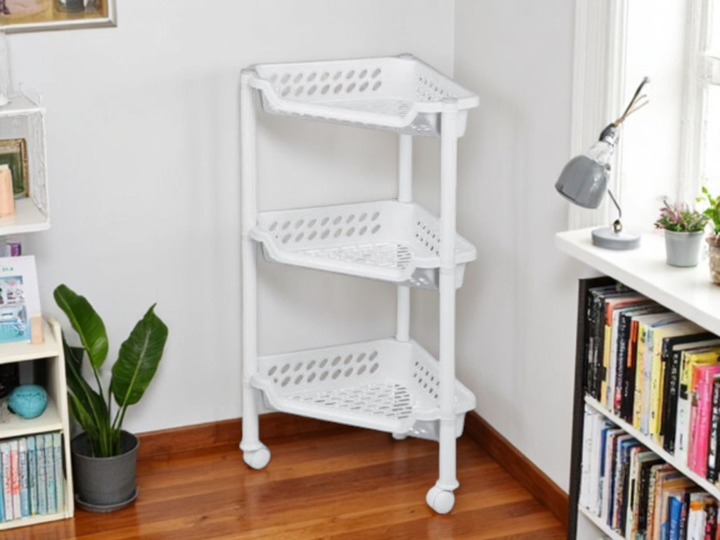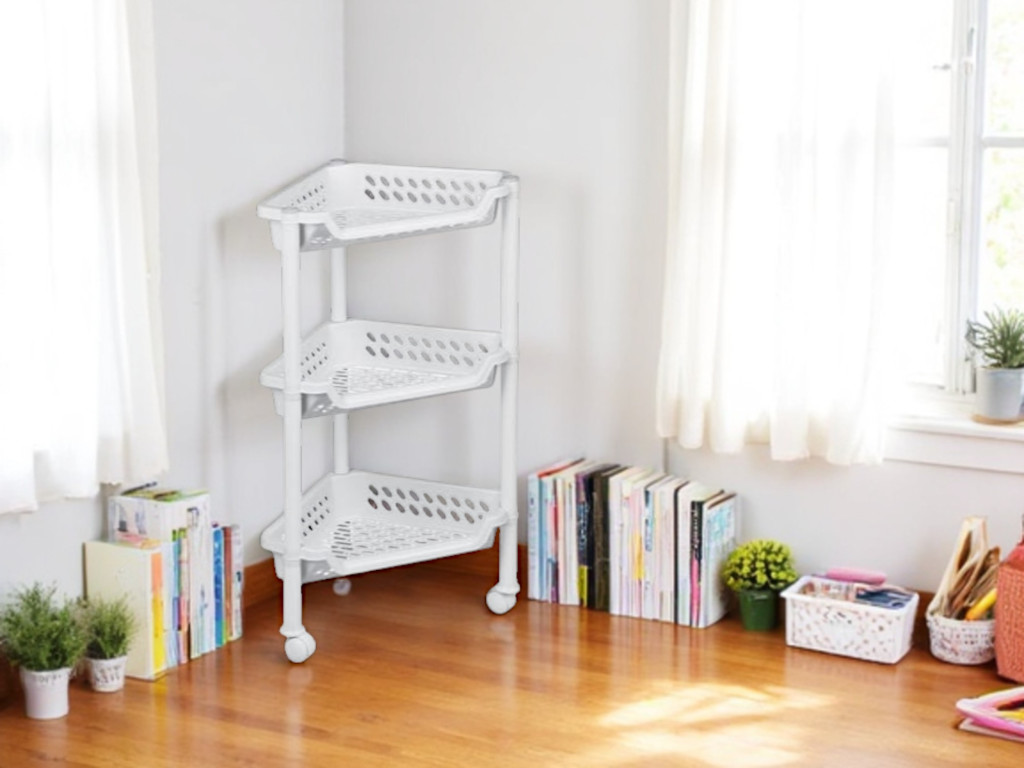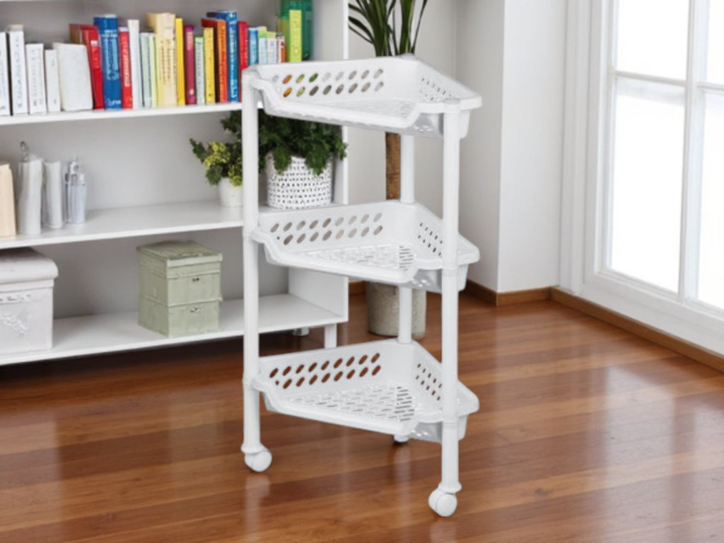 Ez a három polcos gurulós sarokpolc ideális választás a tárolásra. A három polc biztosítja a szükséges tárolóhelyet, míg a beépített kerekek megkönnyítik a polc mozgatását. A perforált polcok elősegítik a szellőzést.