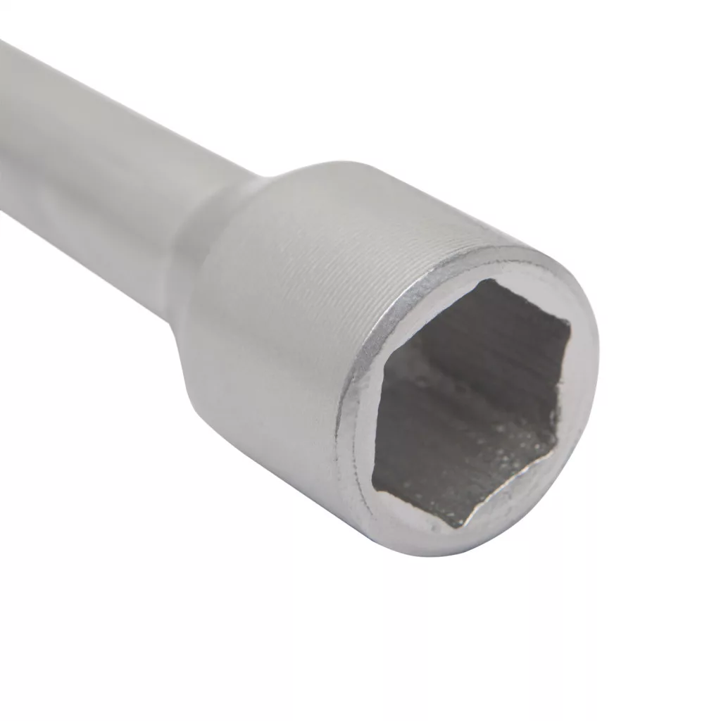 Kerékkulcs a legnépszerűbb kerékcsavar méretekhez. Aluminium ötvözetnek köszönhetően tartós, az erőkar meghosszabbításával könnyebb a csavar meglazítása.
