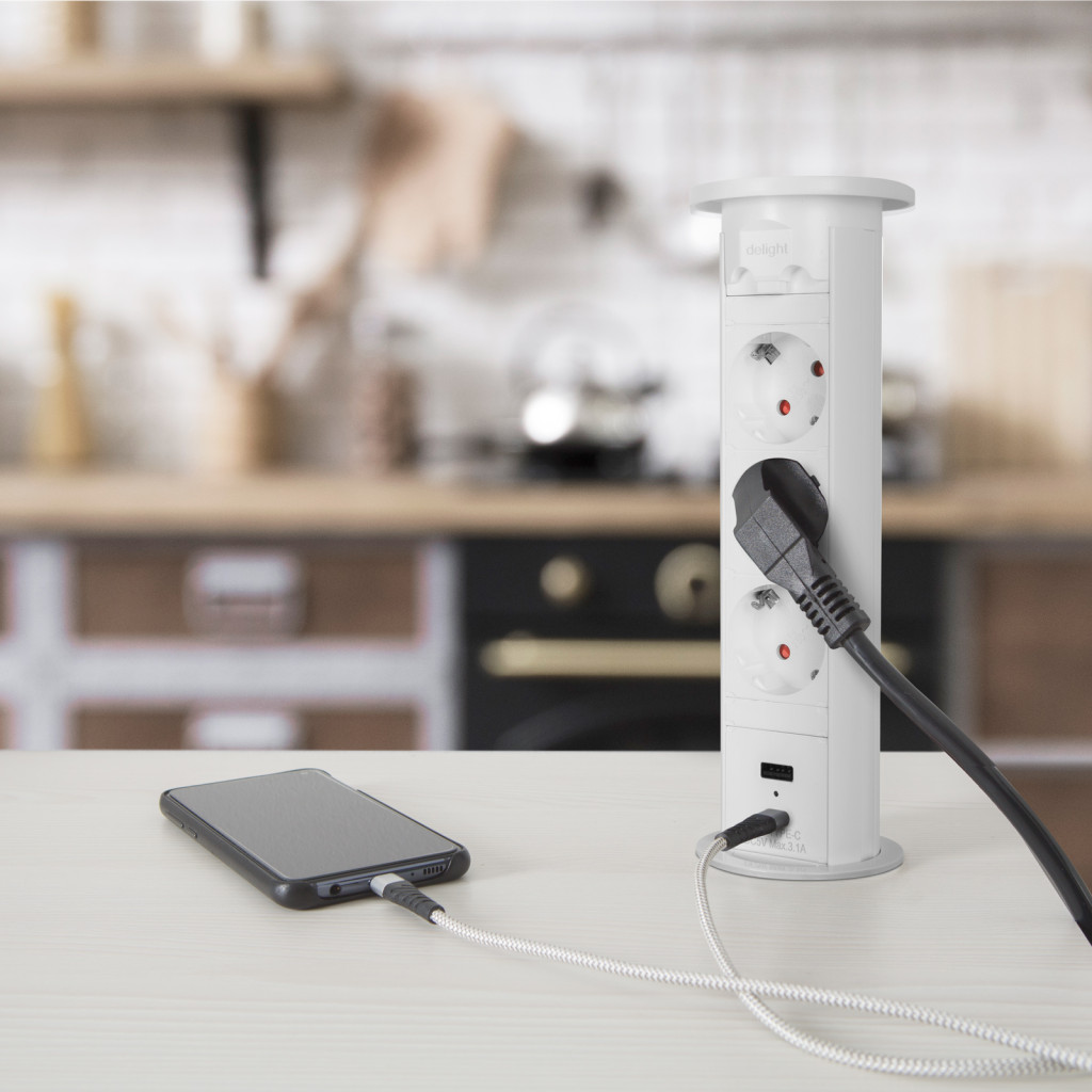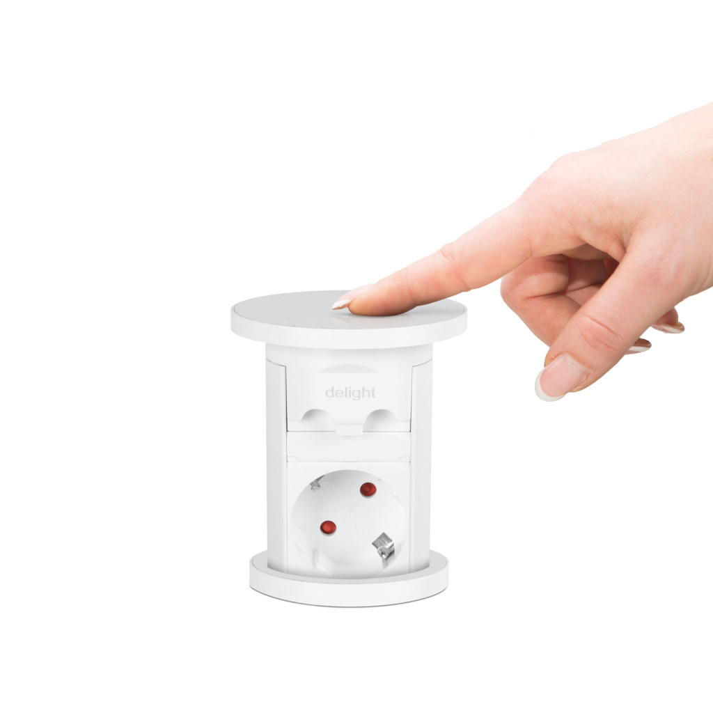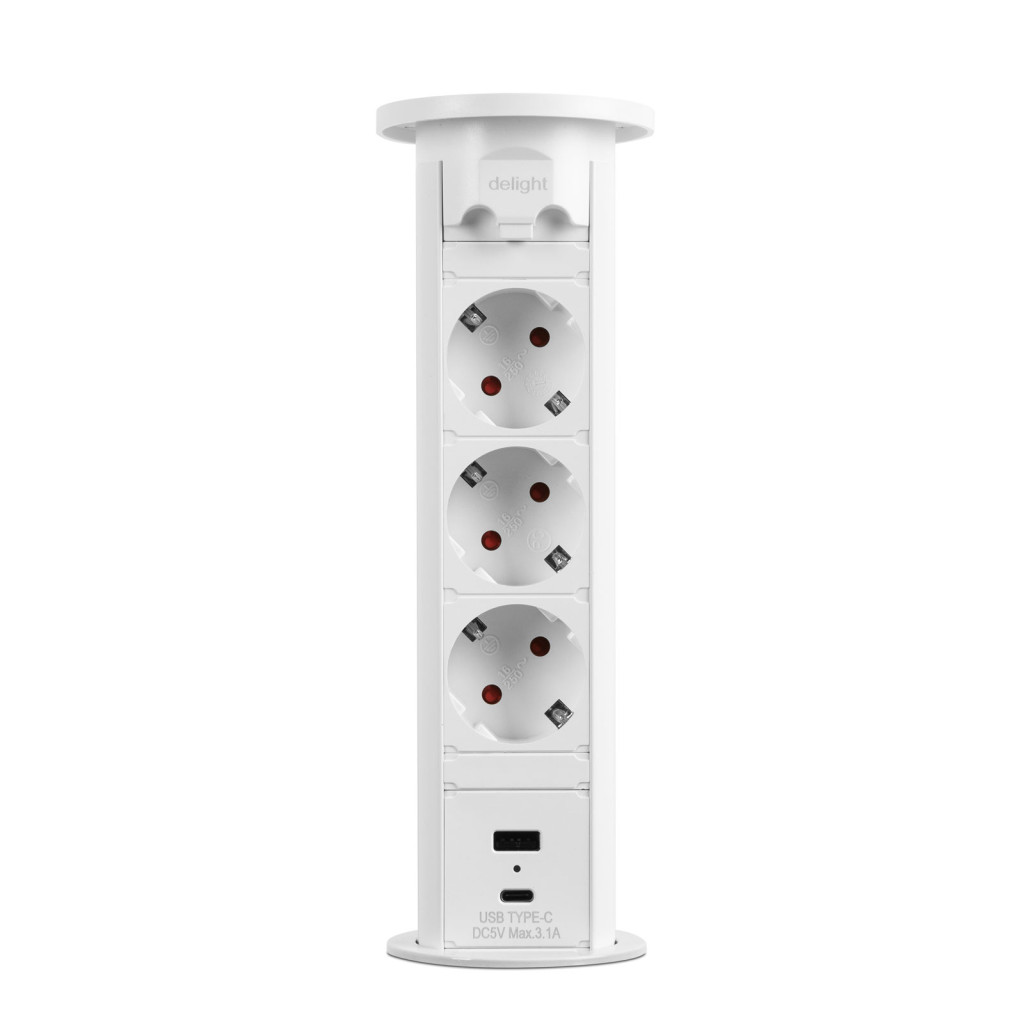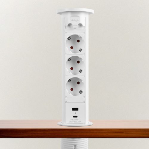 Motorosan süllyeszthető rejtett elosztó irodai és otthoni felhasználásra, fém házzal, 3 db gyermekvédelemmel ellátott hálózati aljzattal, dupla USB töltőegységgel. A legtöbb felületbe és design-ba beleillő kialakítás, függőleges beépítési lehetőség mérsékelten vízhatlan kezelőfelület.