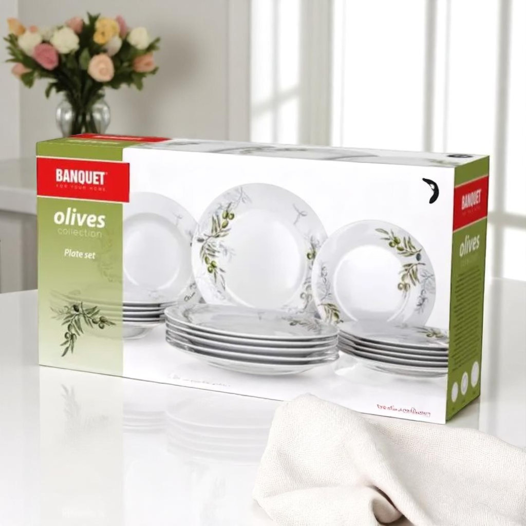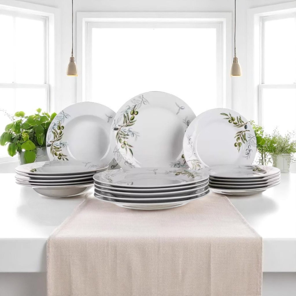 Gyönyörű, olíva mintás, 18 darabból álló tányérszett, melynek tartalma 6 db 24 cm-es lapos,6 db 21,5 cm-es mély és 6db 19 cm-es csemege tányér. A tányérok mosogatógépben és mikrohullámú sütőben egyaránt használhatók.