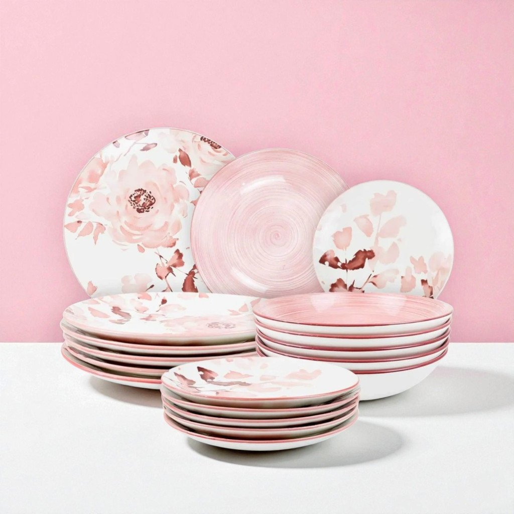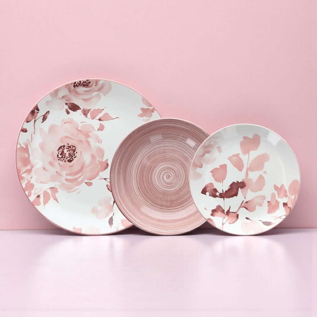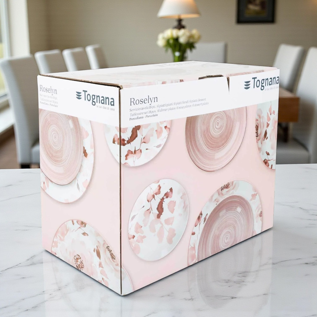 A Tognana Roselyn Madison 18 részes porcelán étkészlet ideális választás mindennapi étkezésekhez és ünnepi alkalmakhoz. A készlet 6 × lapos, 6 × mély és 6 × desszertes tányért tartalmaz, romantikus virágmintázattal és finom rózsaszín tónusokkal. Mosogatógépben biztonságosan használható, elegáns megjelenést kölcsönöz bármely asztalnak.