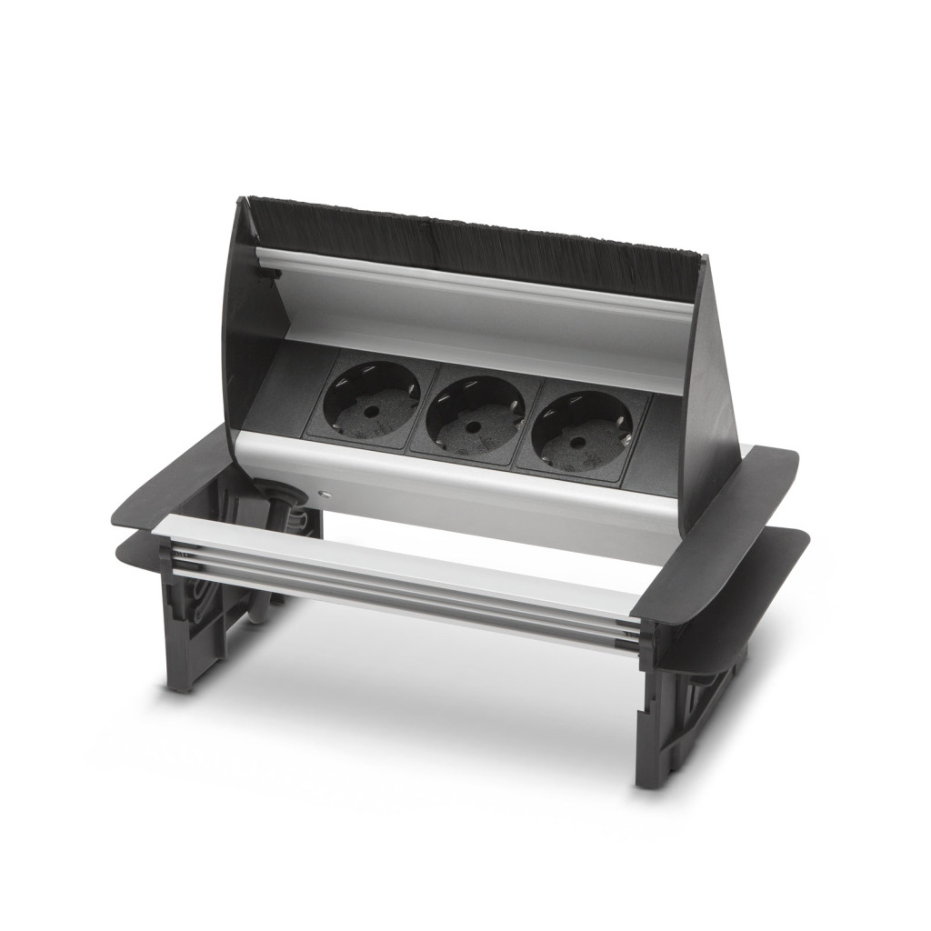 Süllyeszthető elosztó irodai és otthoni felhasználásra, fém házzal, 3 db gyermekvédelemmel ellátott aljzattal. Asztala, bútora legyen mindig elegáns és rendezett, mégis funkcionális. A rejtett elosztó kiváló megoldás lehet ha már például kész konyhával rendelkezik, de nincs elegendő konnektor a kívánt helyen. Ilyenkor falvésés és villamos hálózat bővítés nélkül, remek alternatíva lehet egy rejtett elosztó. Egy mozdulat és máris rendelkezésre áll 3 szabad konnektor. Ideális lehet olyan elektromos eszközökhöz, amit nem folyamatosan használunk, kenyérpirító, vízforraló... Ha használaton kívül vannak, az elosztó egy mozdulattal elrejthető, ezzel is megkönnyítve például a takarítást, valamint rendezett, letisztult külsőt ad a helységnek.