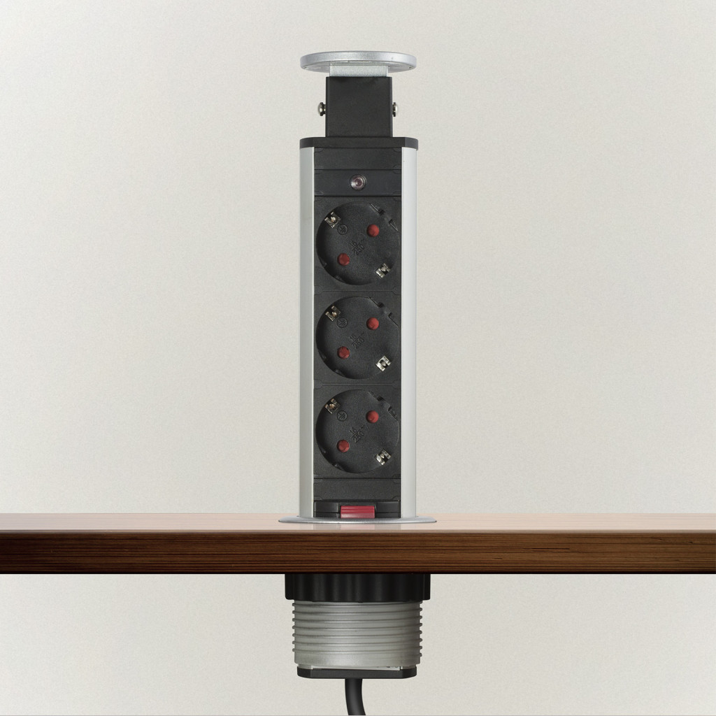 Süllyeszthető elosztó irodai és otthoni felhasználásra, fém házzal, 3 db gyermekvédelemmel ellátott aljzattal. Asztala, bútora legyen mindig elegáns és rendezett, mégis funkcionális. A rejtett elosztó kiváló megoldás lehet ha már például kész konyhával rendelkezik, de nincs elegendő konnektor a kívánt helyen. Ilyenkor falvésés és villamos hálózat bővítés nélkül, remek alternatíva lehet egy rejtett elosztó. Egy mozdulat és máris rendelkezésre áll 3 szabad konnektor. Ideális lehet olyan elektromos eszközökhöz, amit nem folyamatosan használunk, kenyérpirító, vízforraló... Ha használaton kívül vannak, a "töltőoszlop" egy mozdulattal elrejthető, ezzel is megkönnyítve például a takarítást, valamint rendezett, letisztult külsőt ad a helységnek.