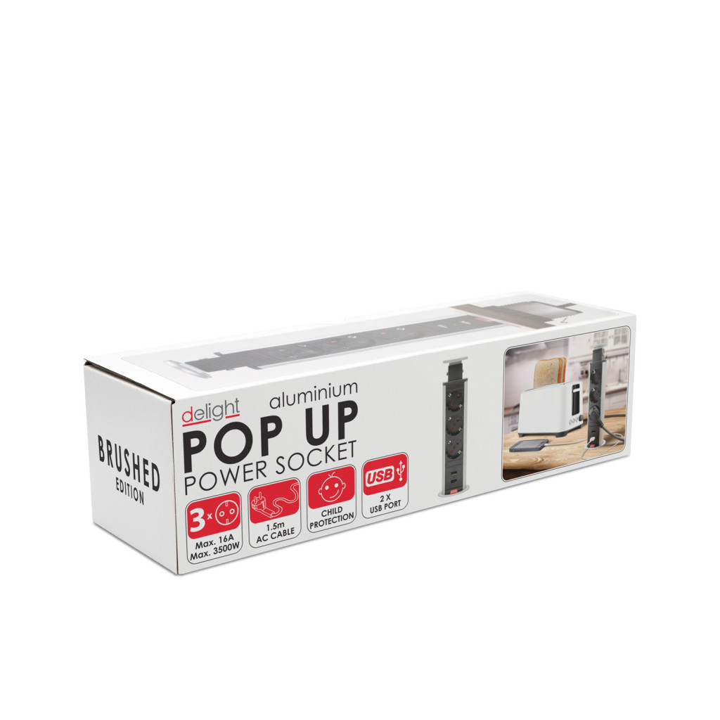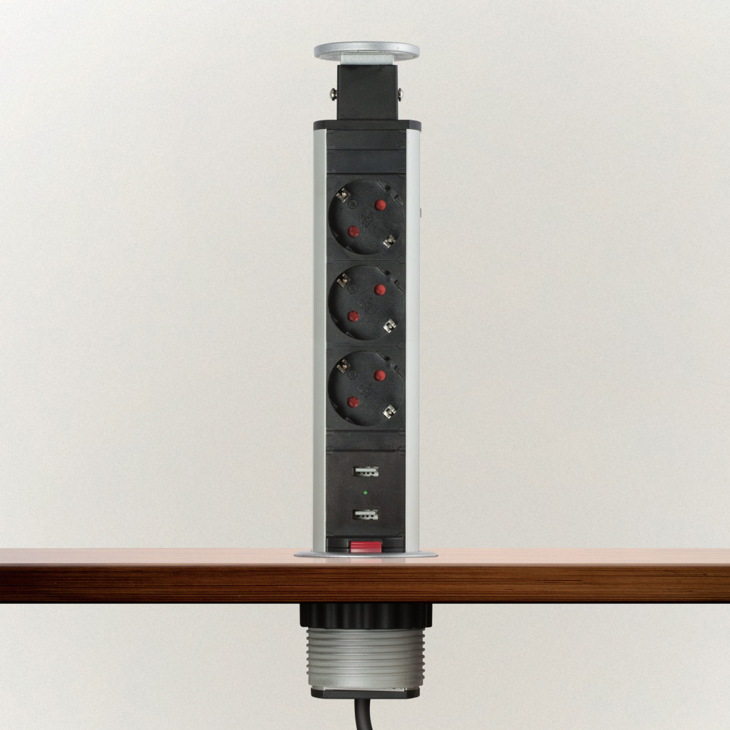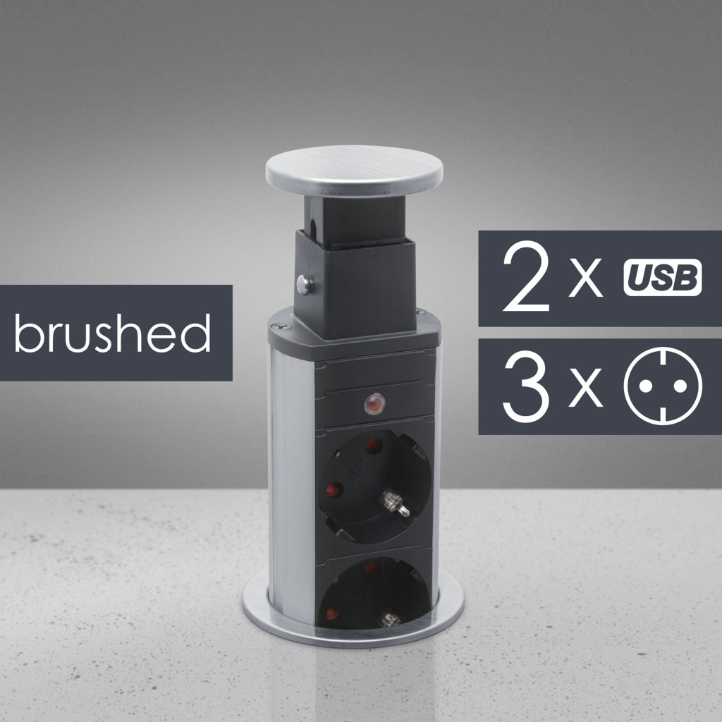 Süllyeszthető elosztó irodai és otthoni felhasználásra, fém házzal, 3 db gyermekvédelemmel ellátott aljzattal és 2 db USB csatlakozóval. Asztala, bútora legyen mindig elegáns és rendezett, mégis funkcionális. Az USB aljaztról könnyen töltheti telefonját, tabletjét vagy egyéb digitális eszközeit. A rejtett elosztó kiváló megoldás lehet ha már például kész konyhával rendelkezik, de nincs elegendő konnektor a kívánt helyen. Ilyenkor falvésés és villamos hálózat bővítés nélkül, remek alternatíva lehet egy rejtett elosztó. Egy mozdulat és máris rendelkezésre áll 3 szabad konnektor. Ideális lehet olyan elektromos eszközökhöz, amit nem folyamatosan használunk, kenyérpirító, vízforraló... Ha használaton kívül vannak, a "töltőoszlop" egy mozdulattal elrejthető, ezzel is megkönnyítve például a takarítást, valamint rendezett, letisztult külsőt ad a helységnek.
