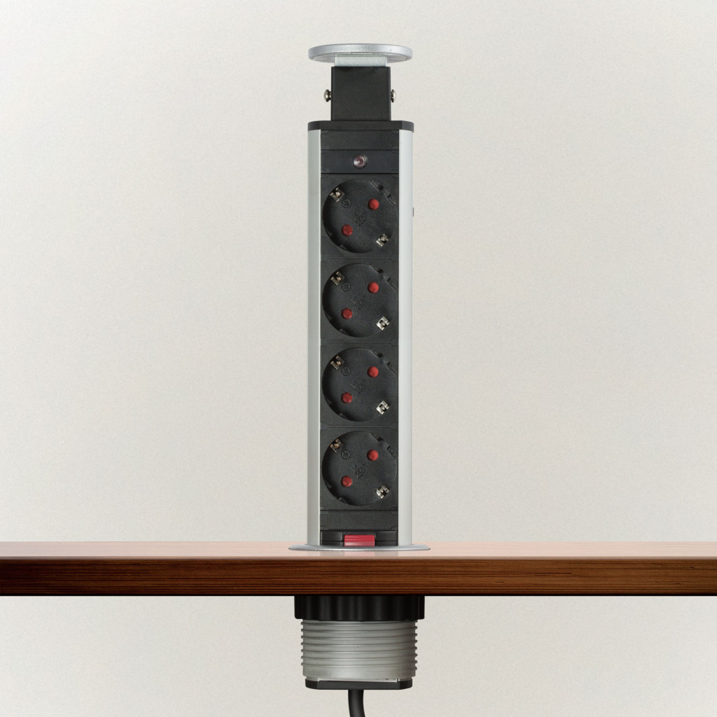 Süllyeszthető elosztó irodai és otthoni felhasználásra, fém házzal, 4 db gyermekvédelemmel ellátott aljzattal. Asztala, bútora legyen mindig elegáns és rendezett, mégis funkcionális. A rejtett elosztó kiváló megoldás lehet ha már például kész konyhával rendelkezik, de nincs elegendő konnektor a kívánt helyen. Ilyenkor falvésés és villamos hálózat bővítés nélkül, remek alternatíva lehet egy rejtett elosztó. Egy mozdulat és máris rendelkezésre áll 4 szabad konnektor. Ideális lehet olyan elektromos eszközökhöz, amit nem folyamatosan használunk, kenyérpirító, vízforraló... Ha használaton kívül vannak, a "töltőoszlop" egy mozdulattal elrejthető, ezzel is megkönnyítve például a takarítást, valamint rendezett, letisztult külsőt ad a helységnek.