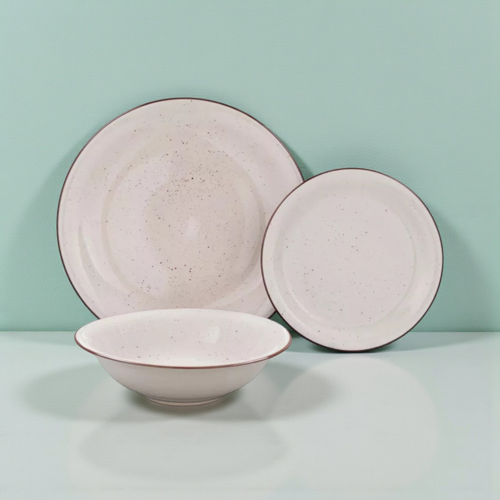 Elegáns, csendes árnyalatú beige kerámia étkészlet 18 darabos kiszerelésben. A készlet 6 × lapos, 6 × mély és 6 × desszertes tányért tartalmaz, így ideális mindennapi használatra és vendégfogadásra egyaránt. Tartós anyaga, egyszerű formája és semleges színe miatt könnyen illeszthető minden stílusú konyhába.