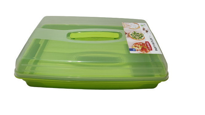 Praktikus négyszögletes ételtároló sütemény és szendvicsek tárolására és szállítására. A kézreálló fogantyú segít a szálításában, kiválóan alkalmas a családi piknikre. Ideális konyhaasztalon, hűtőszekrényben, szekrényben való alkalmazásra. Az ételtárolónak köszönhetően a sütemények és a harapnivalók hosszabb ideig megőrzik frissességüket. A termék élelmiszerrel való kapcsolatra feljogosító tanúsítvánnyal rendelkezik.