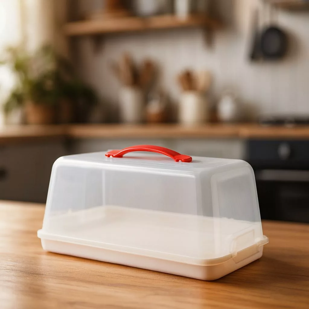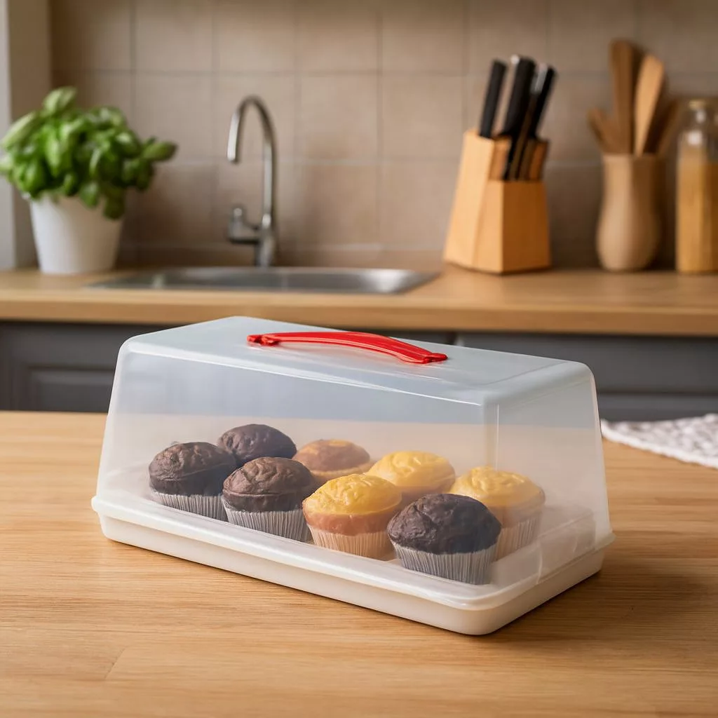 Praktikus négyszögletes ételtároló sütemény és szendvicsek tárolására és szállítására. A kézreálló fogantyú segít a szálításában, kiválóan alkalmas a családi piknikre. Ideális konyhaasztalon, hűtőszekrényben, szekrényben való alkalmazásra. Az ételtárolónak köszönhetően a sütemények és a harapnivalók hosszabb ideig megőrzik frissességüket.