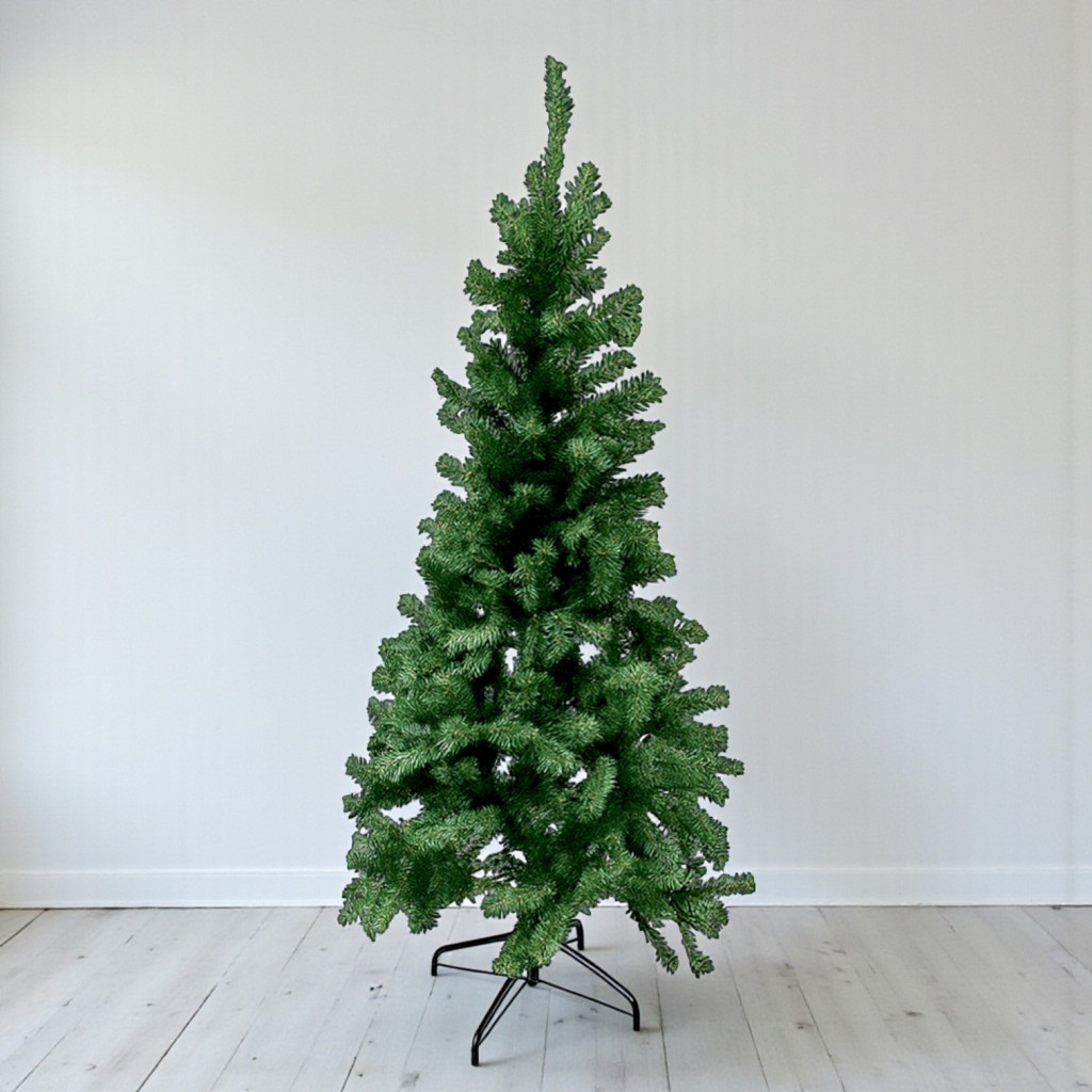 Elegáns, 150 cm magas műfenyő, amely élethű zöld ágaival igazi fenyőfa hatását kelti. Könnyen összeszerelhető, stabil talppal és időtálló kialakítással rendelkezik, így évről évre újra felhasználható. Praktikus megoldás lakásba, irodába vagy kirakatba, ha igényes, mégis gondozásmentes karácsonyfát szeretnél. A műfenyő összehajtott állapotban, karton dobozban kerül csomagolásra.