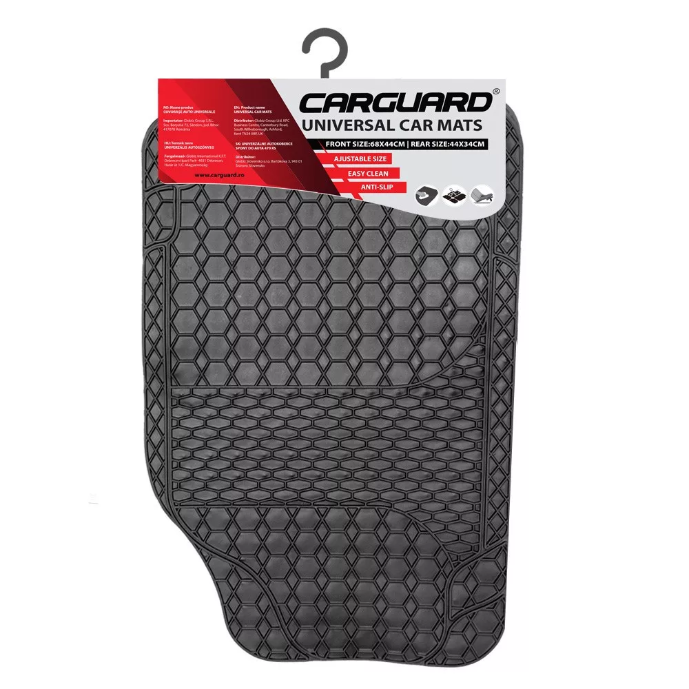 Ez a 4 darabos, autós gumiszőnyeg szett kiváló megoldás a jármű belső terének védelmére és tisztántartására. A szőnyegek strapabíró PVC anyagból készültek, amely ellenáll a kopásnak, a sárnak, víznek és egyéb szennyeződéseknek, így hosszú távon is biztosítják a tisztaságot. A hatszögletű mintázat extra tapadást biztosít a cipőknek, csökkentve a csúszás kockázatát. A peremek segítenek megakadályozni, hogy a szennyeződések és folyadékok kikerüljenek a szőnyeg széléről. PVC anyag egyszerűen mosható, így gyorsan tisztán tartható.