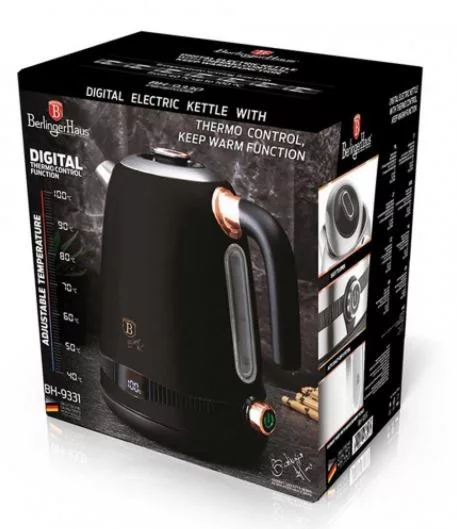 A Berlinger Haus Black Rose Collection digitális elektromos vízforraló rozsdamentes acélból készült.Teát, kávét, de akár egy meleg levest is készíthet használatával.A vízforraló max. kapacitása 1,7 liter, az üvegen található mérőskála segít a kívánt mennyiség betöltésében.Automatikus kikapcsolás a víz felforrásakor.Száraz használat elleni védelem.Melegen tartó funkcióA hőmérséklet 40 ºC és 100 ºC fok között állítható a digitális hőfokszabályzóval.Kivehető és mosható szűrő.Teljesítmény: 1850-2200 W, 220-240 V, 50-60 Hz,