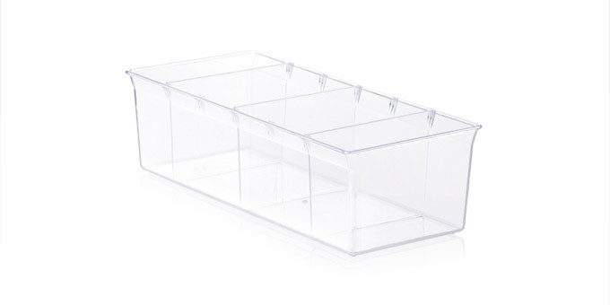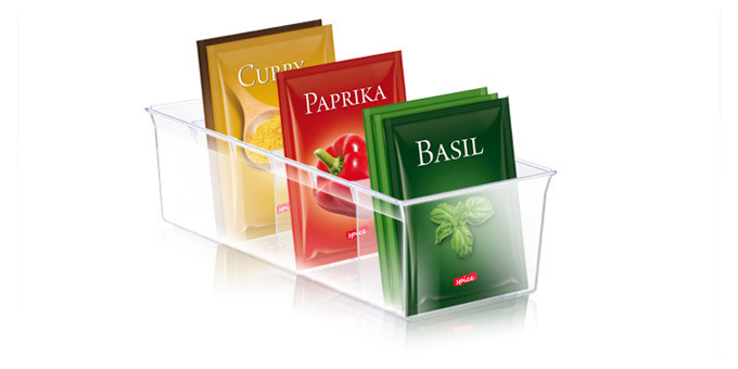 Kitűnően alkalmas szokványos méretű fűszertasakok áttekinthető tárolására. Három állítható válaszfallal ellátott, megfelelően illik normál méretű konyhaszekrényekbe. Tartós műanyagból készült, mosogatógépben mosható.