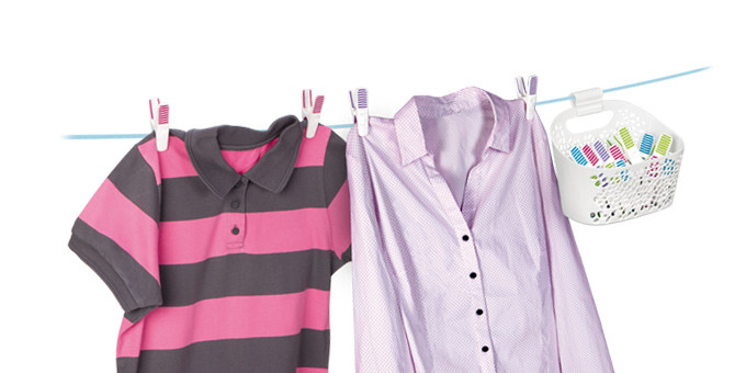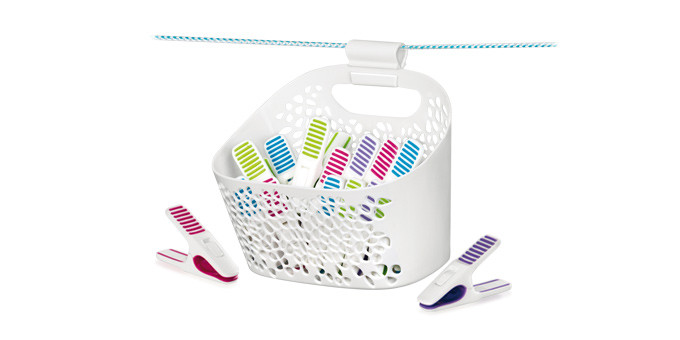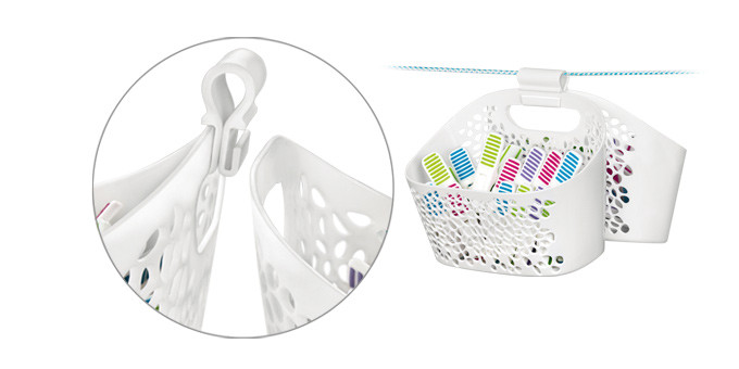 A lágy csúszásmentes bevonattal ellátott csipeszek erősen rögzítik a ruhákat, és nem hagynak maguk után lenyomatokat. Az akasztóval ellátott kosarat fel lehet függeszteni a teregetőre, vagy össze lehet kapcsolni egy másik kosárral.