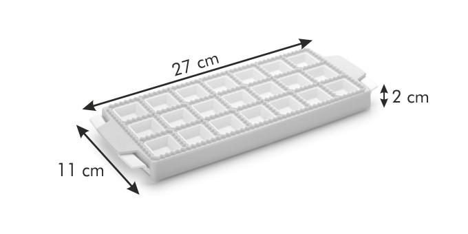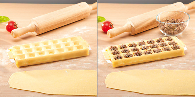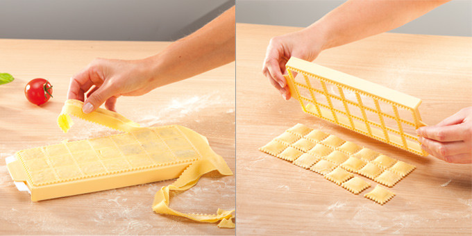 Kiválóan alkalmas hagyományos olasz töltött kis ravioli tészták gyors elkészítésére. A formára terítse rá a tésztalapot, helyezze rá a tölteléket, fedje be a következő tésztalappal, majd a henger néhány húzásával készítsen raviolikat. Csúszásgátlóval ellátva, ellenálló műanyagból készült, mosogatógépben mosható. A használati útmutató a receptekkel együtt a csomagoláson belül található.