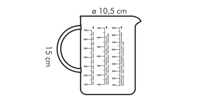 Kiválóan alkalmas folyadékok mérésére és felmelegítésére, valamint porhanyós anyagok mérésére. Hőálló boroszilikát üvegből készült, elektromos és gáztűzhelyeken egyaránt használható, valamint mikrohullámú sütőben, hűtőszekrényben, mosogatógépben mosható.