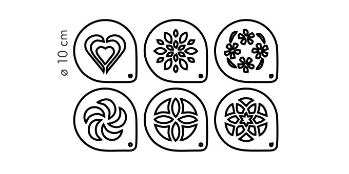 Kiváló a cappucino habjának stílusos díszítéséhez, a választott sablont tartsa szorosan a hab fölött és könnyedén szórja meg finoman őrölt fahéjjal vagy kakaóval. Karikával ellátott a könnyű használat és felakaszthatóság érdekében. Első osztályú ellenálló műanyagból készült, mosogatógépben mosható. 3 év garancia.