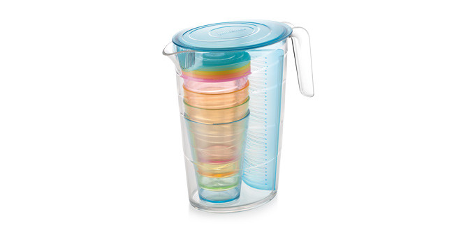 A poharak és fedelek egymásba helyezhetők, használat után a kancsóban tárolhatók.