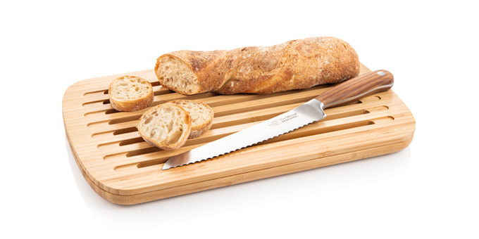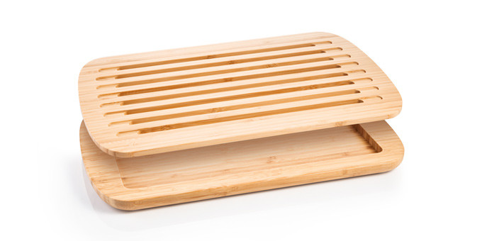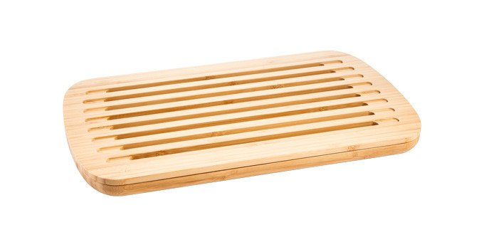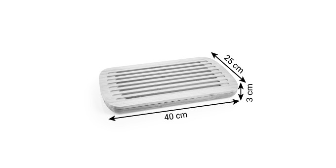 Masszív, kétrészes vágódeszka természetes, magasan ellenálló bambuszból, kiválóan alkalmas a kenyér és pékáru kényelmes szeletelésére. Tágas vágófelület nyílásokkal, amelyek felfogják a morzsákat, amik a deszka aljából könnyen kiszórhatóak. Csúszásmentes kiegészítéssel ellátott a kényelmes és biztonságos használat érdekében. Tisztítsa nedves törlőronggyal, ne mossa mosogatógépben.