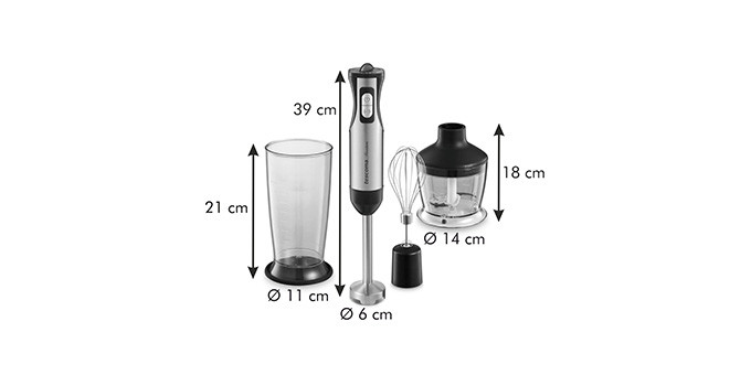 Nagy teljesítményű botmixer állítható fordulatszámmal, pulzáló mixerelés funkcióval, mixer edénnyel, aprító edénnyel és habverőlapáttal. Első osztályú rozsdamentes acélból és ellenálló műanyagból készült.
