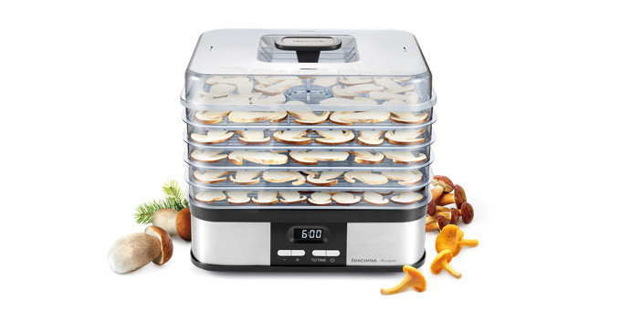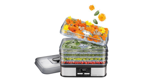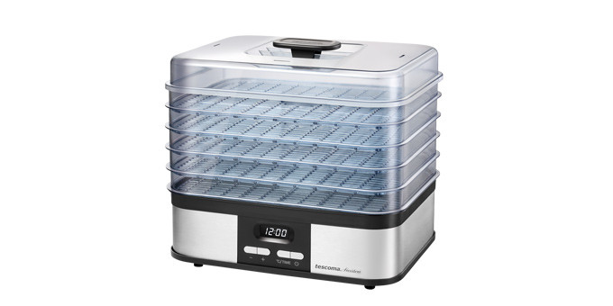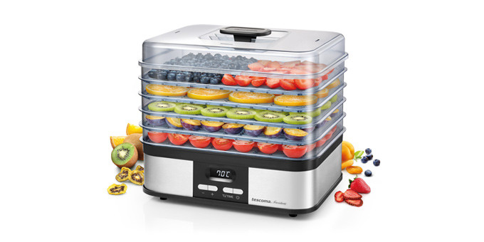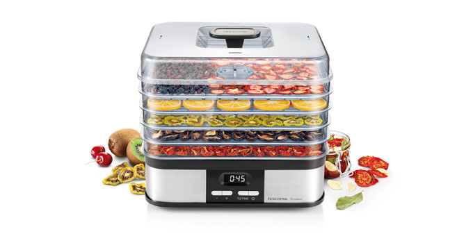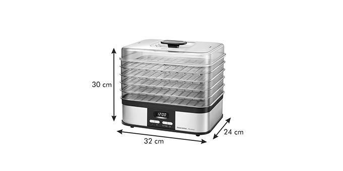 Elektromos élelmiszerszárító forró levegőáramlással, állítható hőmérséklettel és időzítővel, halk üzemmóddal. Kiválóan alkalmas zöldség, gyümölcs, gyógynövény, gomba, hús és has. szárítására. 5 szárítóráccsal rendelkezik, összterülete 3500 cm2. Ellenálló műanyagól és rozsdamentes acélból készült. A Használati útmutató a csomagoláson belül található.