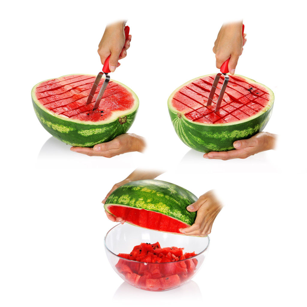Könnyedén és gyorsan porciózhatja fel a görögdinnye húsát kockákra és nagyobb hasábokra. Első osztályú, rozsdamentes acélból és ellenálló műanyagból készült. 3 év garancia.