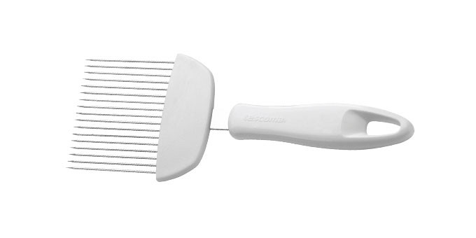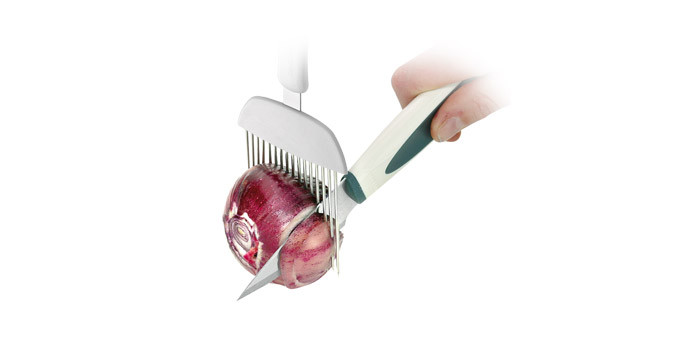 Kiválóan alkalmas a hagyma könnyű és biztonságos szeletelésére. Szúrja bele a megtisztított félbevágott hagymába és a tűk között vágja a hagymát szeletekre. Első osztályú rozsdamentes acélból és tartós műanyagból készült, mosogatógépben tisztítható. 3 év garancia.