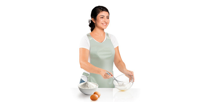 Védi az öltözéket ételkészítés során, ellenálló az átázás ellen. Erős, szintetikus anyagból készül, kétoldali, ismételt használatra szánt. Enyhe tisztítószeres vízzel tisztítsa, és hagyja megszáradni, ne szárítsa fűtőtesten stb.