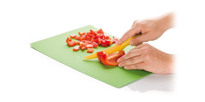 Kiválóan alkalmas mindenféle élelmiszer szeletelésére, csúszásgátló réteggel van ellátva, melynek köszönhetően az asztalhoz tapad és nem csúszik el. Hajlékony műanyagból készült a könnyű áthelyezés és kiszórás céljából. Mosogatógépben mosható.